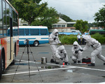 栄警察署は6月25日、路線バス車内での有毒物質を使ったテロに対する訓練を神奈川中央交通(株)横浜営業所で実施した。8月に横浜で開催されるアフリカ開発会議で世界各国の要人が集まることに備えてのもの。