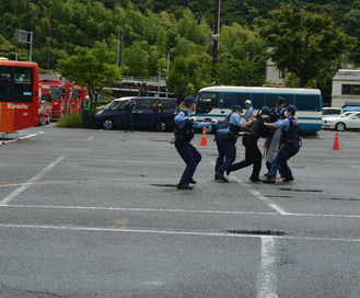 参加したのは同署に加え、神奈中バス、栄消防署、栄消防団、栄区役所、横浜栄共済病院の職員。通勤時間帯に刃物を持った男がスプレーボトルで薬品を撒き負傷者が多数発生しているという想定で、犯人確保や負傷者救護などが行われた。