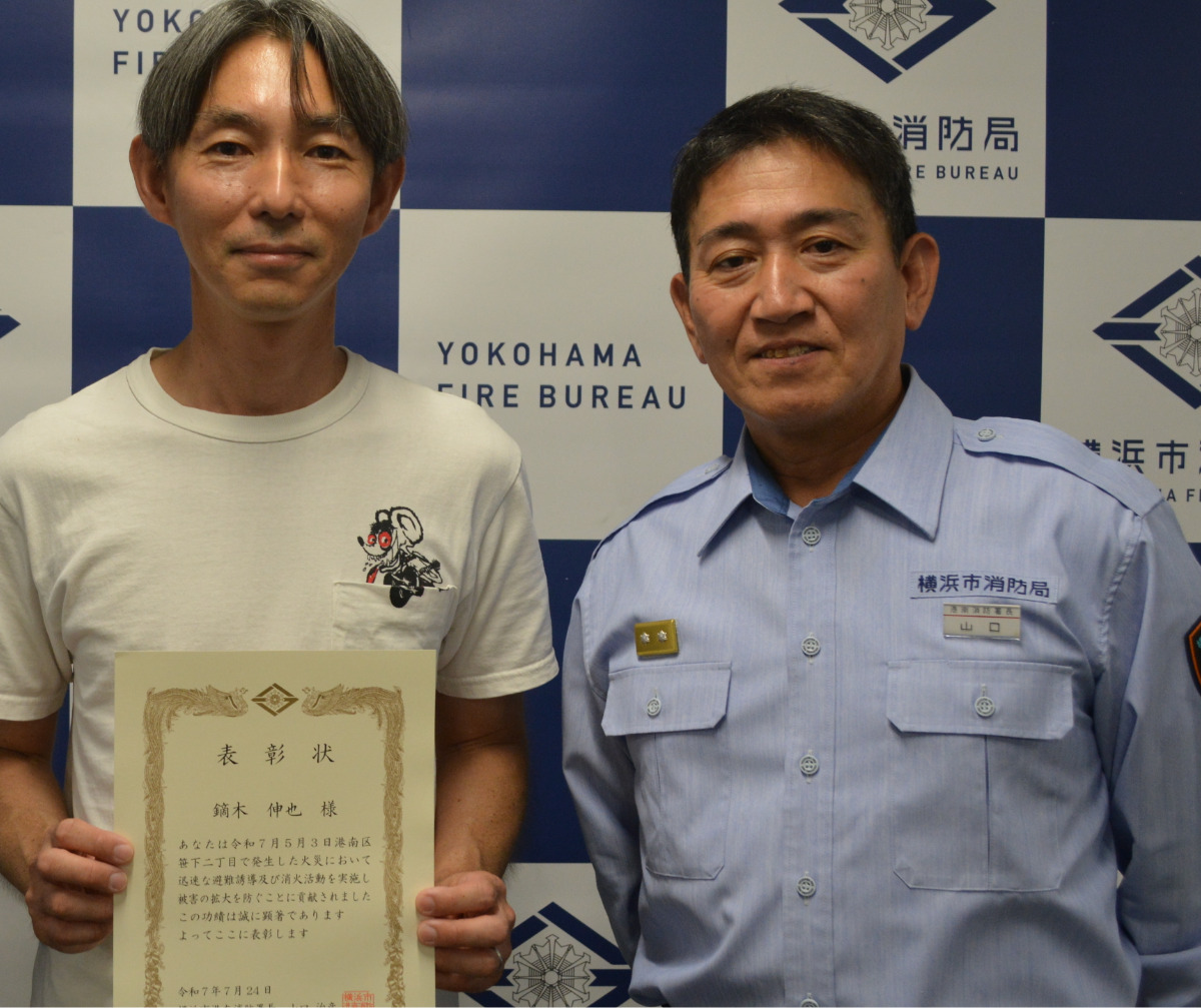港南区の消防団員、鏑木伸也さんが7月24日、5月に発生した火災現場で避難誘導を行い人命を救助したとして港南消防署から表彰を受けた。