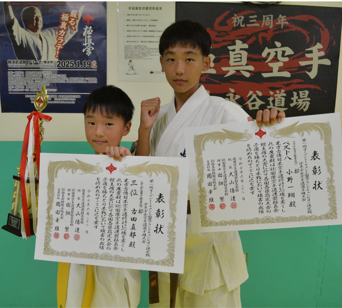 大阪で行われた極真空手の大会「第1回国際グランドチャンピオン決定戦」 でこのほど、港南区上永谷にある上永谷道場の古田真都さんが小学3年生男子・軽量級の部で3位に、小野一翔さんが中学1年生男子・軽量級の部でベスト8に輝いた。