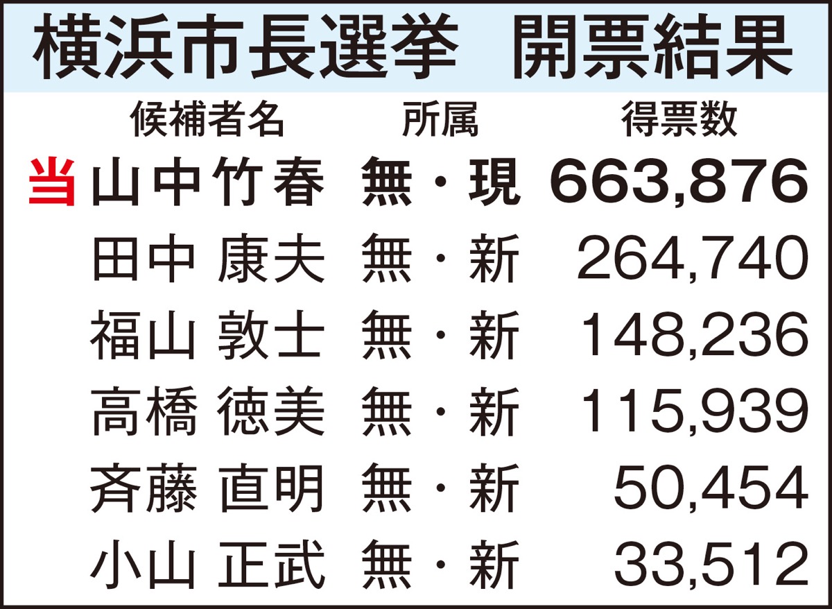 任期満了に伴い、8月3日に投開票された横浜市長選挙は現職の山中竹春氏(52)が約66万票を得て再選された。自民、公明、立民の各党が支援し、4年間の実績を強調した選挙戦を展開。幅広い支持を集めて新人5人を圧倒し、得票率は5割を超えた。投票率は41・64%で前回を7・41ポイント下回った。