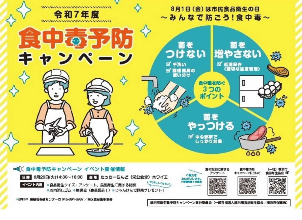 栄福祉保健センターは区の食品衛生協会と8月26日(火)、「令和7年度食中毒予防キャンペーンイベント」を栄公会堂にて開催する。