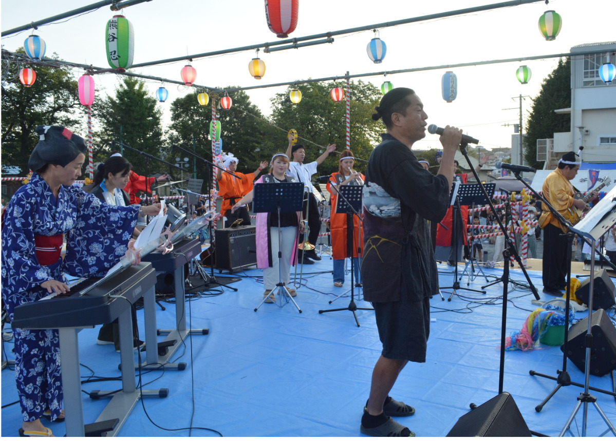 第1部夏祭りプログラムの永野小学校教諭バンド「NGN133」が登場すると、同校児童や保護者らがステージを取り囲むように観覧した。