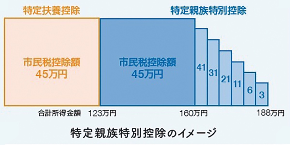 これを受け、横浜市でも市税条例を改正。「特定親族特別控除」が創設されました。特定親族とは大学生年代の子どもなどを指し、来年度から下段図のように160万円を超えるまでは市民税控除を満額(45万円)で受けられるようになります。(超えても188万円まで段階な控除あり)