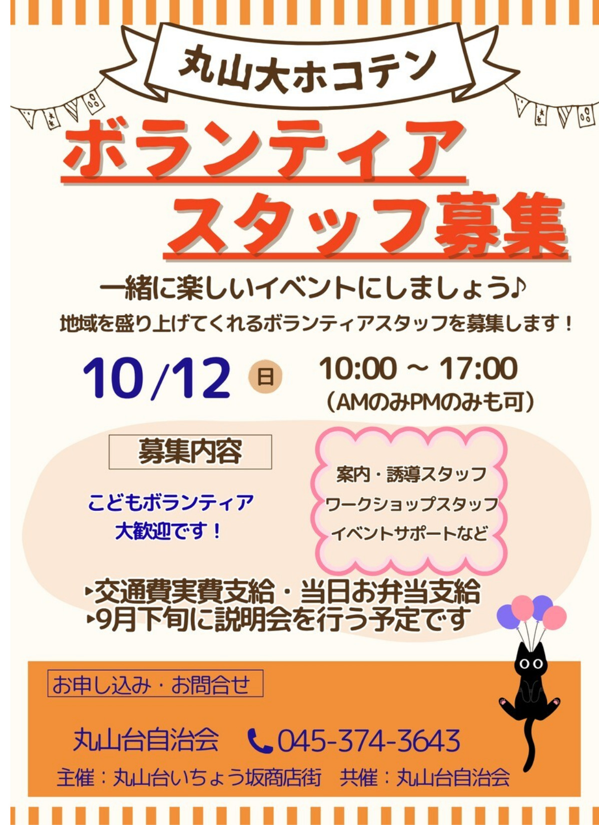 丸山台いちょう坂商店街と丸山台自治会は現在、10月12日(日)に開催される恒例イベント「丸山大ホコテン」のボランティアスタッフを募集している。