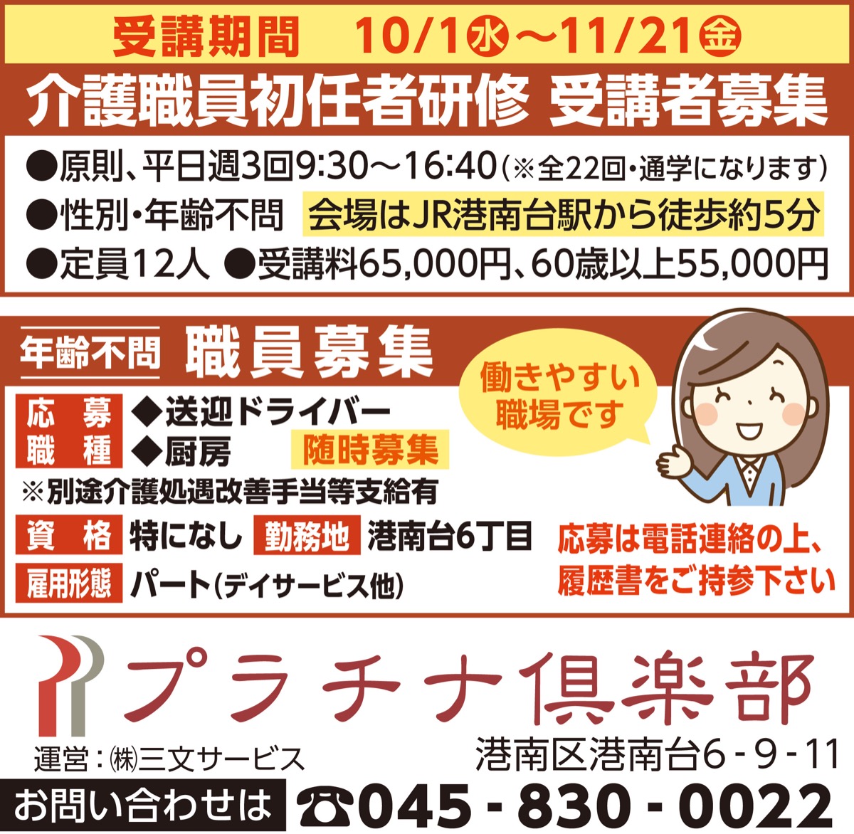 こう話すのは、港南台を中心に介護保険指定事業所として「プラチナ倶楽部」を運営する(株)三文サービスの河野文彰社長。「介護は誰にでも起きうる問題で、自分のための準備と思い資格取得の勉強をしてみませんか」。