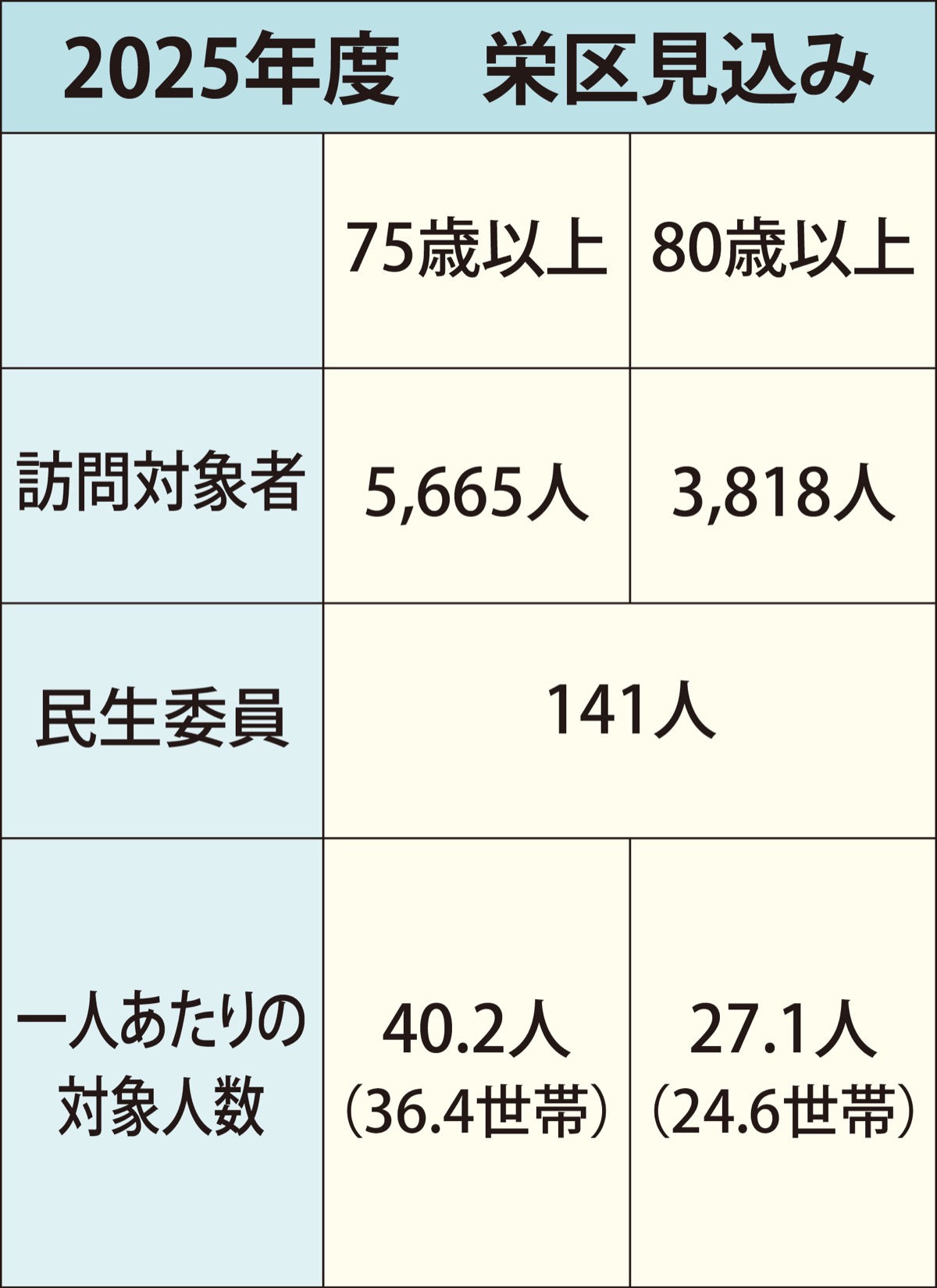 現在、栄区の民生委員は141人。これに対し、75歳以上の対象者は5665人と見込まれている。例年通りであれば一人あたり40・2人を訪問する。しかし対象を80歳以上に引き上げることで対象者が3818人になり、一人当たり27・1人を担当。32%の減少になる。