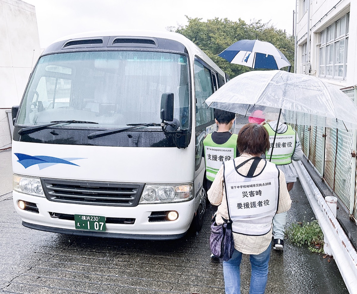 避難してきたが、地域防災拠点での生活が難しい住民のため、福祉避難所である港南中央地域ケアプラザへ要援護者を搬送する訓練も同時に行われた。中学校と港南区役所、同ケアプラを無線でつなぎ、要援護者の受入れ体制を確認した後に、バスが出発。宮島運輸が所有するマイクロバスで5組の要援護者・支援者10人を同ケアプラへ搬送した。