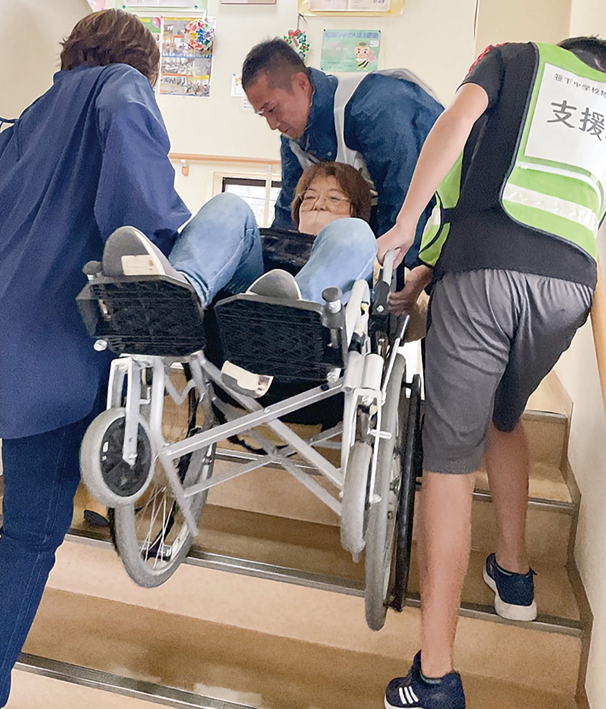 ケアプラ到着後には、車いすに乗った人を階段で上げるデモンストレーションなどを行い、有事の際の対応方法などを参加した住民は学んだ。