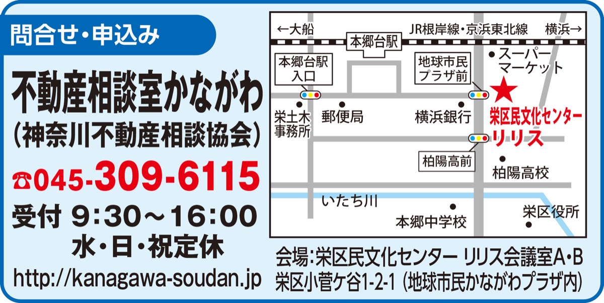 「不動産相談室かながわ」が、毎月各地で開催している相続と不動産に関する無料相談会。11月は15日(土)、栄区民文化センター会議室A・Bで開かれる。