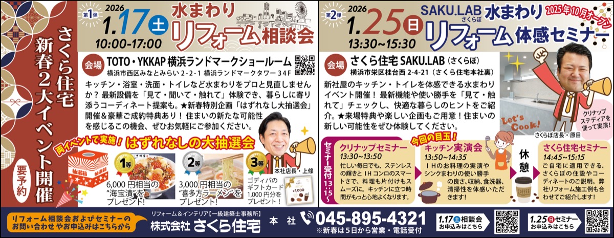 栄区桂台西に創業して2027年で30年を迎えるリフォーム会社「(株)さくら住宅」。小さな住まいの困りごとから、フルリノベーションまで多様な工事に対応できるのが特徴だ。また、地域貢献に力を入れ、住民の憩いの場である「さくらラウンジ」や第2社屋の「SAKU・LAB(さくらぼ)」を有効活用した取り組みも多数行われている。今回は同社の歴代の代表取締役に話を聞き、「リフォームや地域にかける思い」、「今後の展望」などを聞いた。