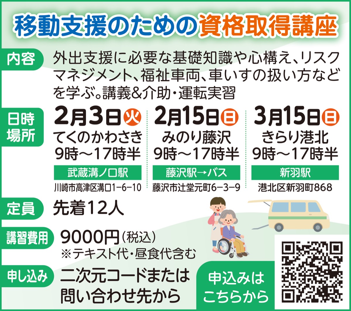 送迎ドライバーとして活躍するための福祉有償運送、セダン等運転者講習を2月3日(火)てくのかわさき(高津区)、2月15日(日)みのり藤沢(藤沢市)、3月15日(日)きらり港北(港北区)で実施。