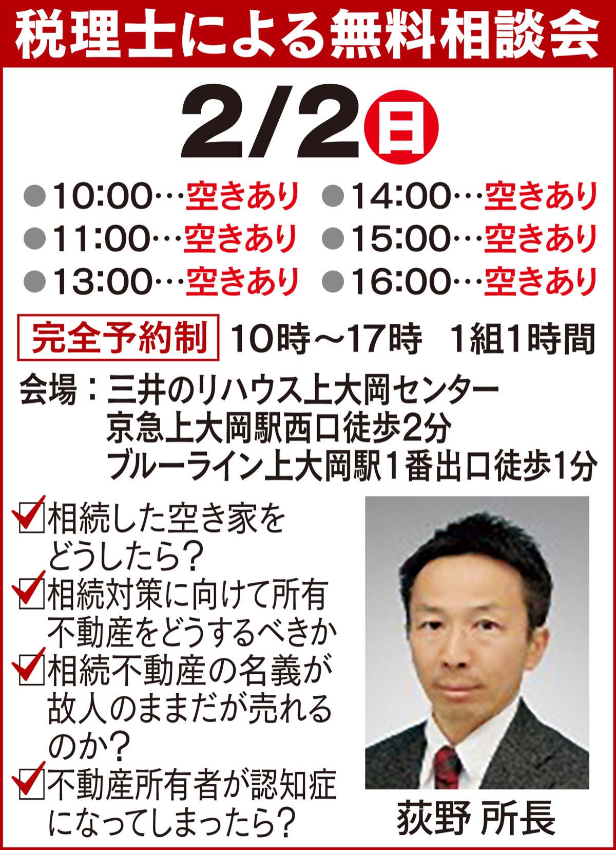 家族の集まりで話題になった「相続税・贈与税が心配」「空き家を何とかしなくちゃ」――。この文言にピンと来た人に勧めたいのが、上大岡駅前、三井のリハウス上大岡センターの「税理士による個別無料税務相談会」だ。日にちは2月2日(日)、時間は午前10時から午後5時まで。1組1時間。秘密厳守のため、完全予約制。同センター提携の税理士が対応してくれる。