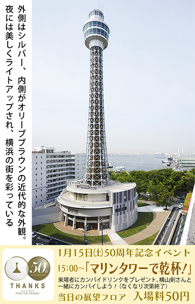 そんなマリンタワーの50歳の誕生日を祝おうと、1月15日には「記念イベント」が行われる。当日は展望フロアに50円で入場できるほか、マリンタワーのオフィシャルソング「マリンタワー・ゴーゴー」を歌うクレイジー・ケン・バンドの横山剣さんがスペシャルゲストとして登場。来場者とともに乾杯で50周年をお祝いする。