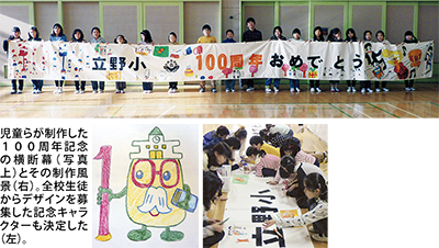 今年10月には創立100周年の記念式典が行われる予定で、それまでにも様々な取り組みが行われる。このほど完成した横断幕(写真上)は、教職員の呼びかけで、「マンガイラスト図工クラブ」の児童20人が昨年10月から制作に取り掛かり、2月に完成したもの。本来は3月中に掲示する予定だったが、震災の影響で今月18日に延期された。