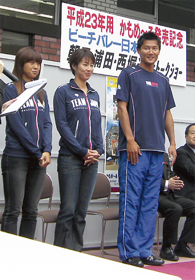 暑中見舞いや残暑見舞い用のくじ付きはがき「かもめーる」の販売が始まった6月1日、西区の横浜中央郵便局でビーチバレー男子日本代表の朝日健太郎選手と、同女子代表ペアの浦田聖子選手、西堀健実選手が参加して記念イベントが行われた。