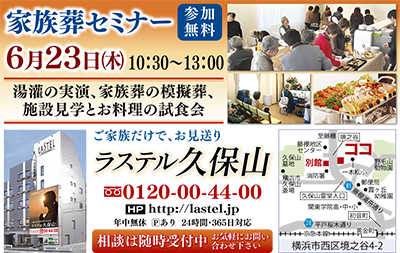 今月のセミナーは6月23日(木)。映画「おくりびと」で注目された納棺士による”湯灌(ゆかん)”の実演や家族葬の模擬葬体験のほか、実際の通夜で振舞われるブッフェ式の温かい料理の試食会も行われる。参加無料。