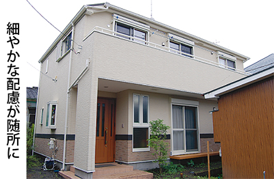 4月に完成したばかりのI邸も同社が手がけた新築住宅の一つ。若いご夫婦と2人のお子さん4人家族のIさん。大手住宅メーカーも検討したというが、近くに住むご両親から同社の評判を聞き、依頼を決めた。「子どもと遊べる畳のある和室を1、2階に作りたい」という奥様の要望に、在来工法による自由な間取りで応えた同社。奥様は「スイッチや手すりの位置を家族の身長に合わせて決めてくれるなど細かい気配りに感激しました。気になった点があっても大工さんに直接相談できるので、すぐ対応してくれました。今は本当に満足しています」と笑顔を見せる。