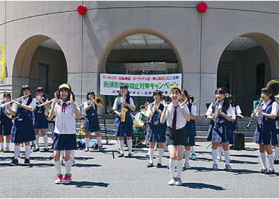 当日は防犯を呼びかけるチラシなどの配布のほか、市立港中学校吹奏楽部の生徒による演奏も行われた。人気テレビドラマの曲などの演奏に、週末でにぎわう中華街では多くの人が足をとめ、拍手を送っていた。