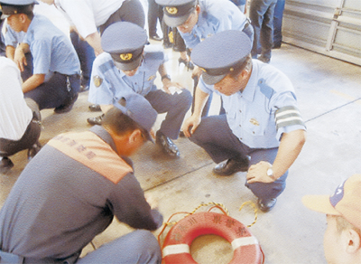 当日は、交番勤務員を中心とした若手の署員およそ60名が参加。消防署員から浮環へのロープの結び方や投げ方、ペットボトルを使った緊急用の救助方法などを習った。その後石崎川で実際に救助訓練を行った。