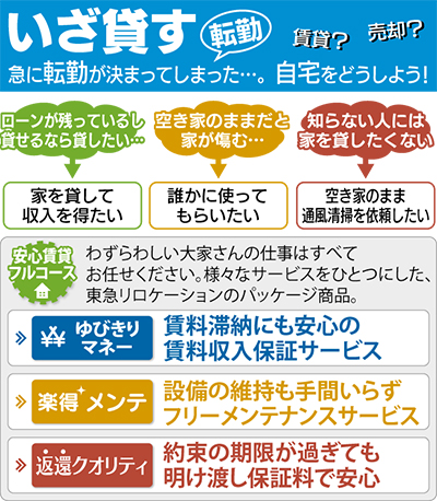 急な転勤。まだローンの残る自宅をどうするか。そんな時頼りになるのが東急リロケーション(株)の「リロケーション」システムだ。
