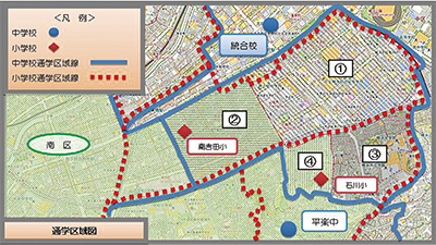 その後、昨年12月に行われた検討委員会の3回目の会合では、統合校の通学区域が新たな議題に。統合校が従来の両校の通学区域を踏襲する形では、生徒数に対して吉田中校舎の教室数が不足すること、またこれまでの富士見中の通学区域内では中区と南区の行政区境線を跨いでいるという学校行政上の問題も踏まえ、市教委から検討委員会に対し近隣の平楽中(南区)も含めた4つの学区案が提案されていた。
