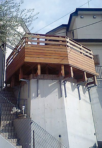 M邸のウッドデッキも同社が手がけた好例の一つ。依頼は「デッドスペースの庭の一角にウッドデッキを」というもの。そこで同社は鉄骨の張り出しで土台を作り、その上に設置した(写真)。素材には耐水性に優れたウリン材を使用し、最小限の手入れで済むような工夫もなされており、今や3人の小さな子どもの遊び場として、家族の憩いの場として大活躍している。Mさんは「想像以上の仕上がりで満足です」と喜ぶ。