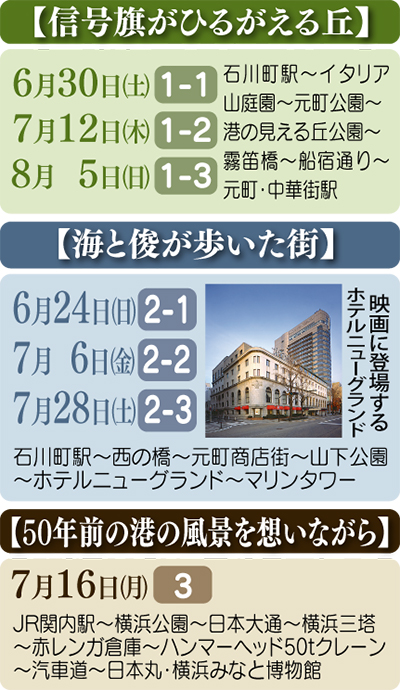 申し込みは往復はがきに希望コース番号(複数可)、参加者全員の氏名、住所、電話番号を記入の上、〒231-0063横浜市中区山下町15横浜シティガイド協会「コクリコ坂」係へ。同協会HPからも申し込める。問合せは【電話】045・228・7678まで。