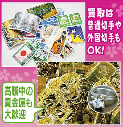 郵便局では現金化できない切手も、同店ならシートだけでなくバラまで買取ってくれる。「昔ご両親が集めていたコレクションをお持ちになる方も多いですね。普通切手や書き損じの年賀ハガキ、レターパック、収入印紙も即現金化します」とスタッフ。また、衣替えの時に出てきた貴金属も売れば、家もスッキリ、臨時ボーナスに。