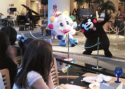 肉類や魚介類、野菜など熊本産の多彩な食材を中心に開催されているこのフェア。5月18日には熊本のゆるキャラとして人気の「くまモン」が、よこはまコスモワールドのキャラクター「コスモくん」とともに登場。「くまモン」体操を披露したほか、来場者と気軽に記念撮影に応じていた。