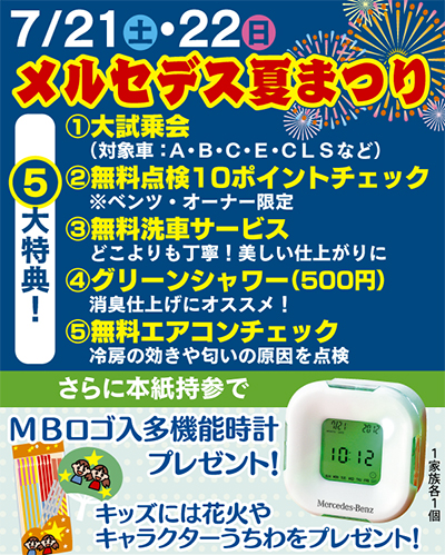 さらに本紙持参の来場者には温度計やアラーム、タイマーがついたMBロゴ入り特製時計をプレゼント。キッズ向けの夏休みグッズも用意してある。家族で気軽に参加してみては。