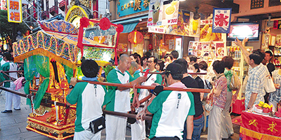 商売繁盛の神として、現在も多くの信仰を集める関羽。当日は関帝廟の神殿内で儀式が行われた後、関羽を神格化した「関聖帝君」の分身を乗せた中国式の絢爛豪華な神輿を中心に、約200人の行列が中華街全体を練り歩いた。