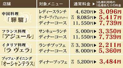 ヨコハマ グランド インターコンチネンタル ホテルでは、料理代金が最大33%割引になる「トゥー・プラス・ワン」を、大好評につき期間延長。11月30日(金)まで実施する。