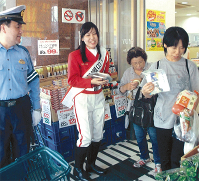その後、地元スーパー前では買物客らにチラシなどを配布。尾崎さんは「少しでも交通事故の減少に繋がれば」と話していた。