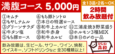 忘年会のお店選びは幹事さんの腕の見せどころ。食べる人も、飲む人も満足させたいなら、「和牛焼肉・犇和(ひしわ)」の「満腹コース」(=左・5000円)がおすすめ。