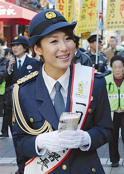 細木さんはその後、署員や防犯指導員、県警キャラクターのピーガルくんらとともに中華街で啓発チラシなどを通行人に配布しながら「振り込め詐欺に気を付けて下さい」と呼びかけていた。
