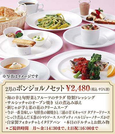 同店では月ごとにメニューが替わる「ボンジョルノセット」が大人気。南イタリアの伝統的な郷土料理をベースに、産地直送の朝摘み野菜や漁船直送の鮮魚をふんだんに使ったヘルシーイタリアン料理で、前菜からデザートまでついてこの内容は納得価格だ。