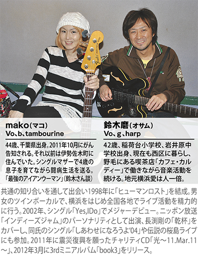 昨年デビュー15周年を迎えたロックバンド「ヒューマンロスト」。西区在住の鈴木磨(おさむ)さん(42)とともにツインボーカルを務めるマコさん(44)は末期がんと闘いながら音楽活動を続けている。4月21日(日)、伊勢佐木町「クロスストリート」で行われるワンマンライブを前に、これまでの軌跡をたどった。
