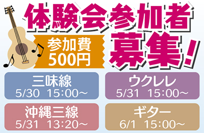 500円で通常クラスと同等の内容が学べると人気のレッスン。同会は関東10カ所に教室を持ち、多くの人がウクレレや沖縄三線、ギターに三味線と、様々な楽器を楽しんでいる。西口校に通う宜名眞(ぎなま)さんは「初心者だった私もすぐに馴染め、素敵な仲間や先生に囲まれて毎回通うのが楽しみです」と笑顔で話す。教室は駅徒歩5分で買い物にも便利。楽器は無料貸出。「楽譜が読めない人でも1曲弾けるようになる」と評判の体験会は予約先着制。この機にぜひ挑戦してみては。