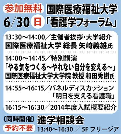 医療福祉の多彩なエキスパートを育てる国際医療福祉大学(小田原市他)が主催する「看護学フォーラム」が、6月30日(日)、ホテル横浜ガーデン(中区山下町)で開催される。時間は、午後1時半〜4時半(1時開場)。参加は無料。予約制。席状況により当日参加可。