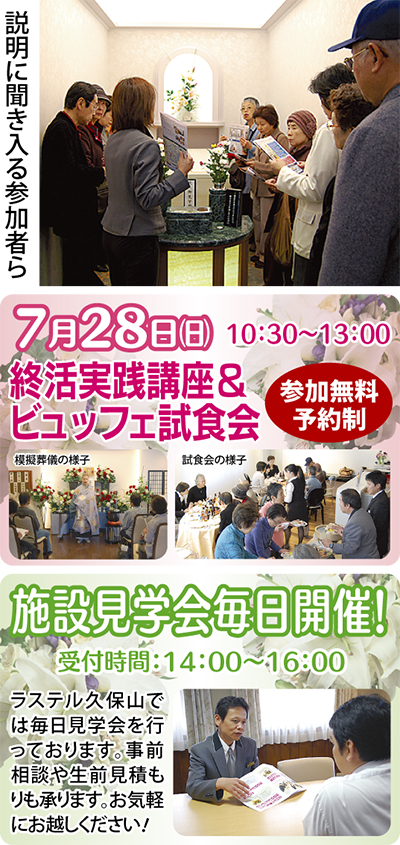 今話題の家族葬や葬儀の正しい知識を学べる終活セミナーが7月28日、西区の葬儀式場「ラステル久保山」で行われる。参加無料。