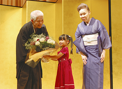 孫のさやかちゃん(5)から花束を受け取った鶴田さんは「こんなにも多くの方に祝って頂き万感胸に迫る思いです。これからの人生はお世話になった皆さんへの恩返しとして、精一杯頑張ります」と語った。