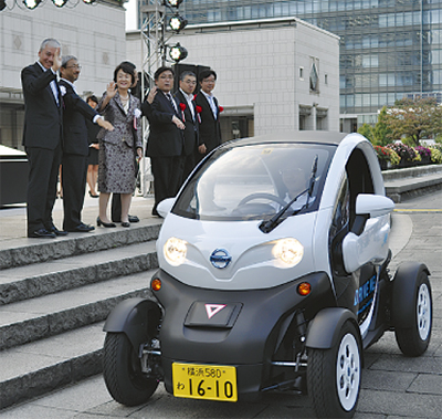 実験開始に先立ち、横浜美術館前のグランモール公園で10日に行われた出発式には林文子市長ら関係者が出席。超小型モビリティの出発を見送った。