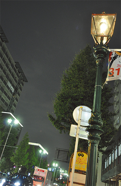 今回ガス灯が新設されたのは、馬車道通りを抜けた本町4丁目の交差点から続く万国橋通り。昨年横浜第二合同庁舎側の歩道に6基、今年反対側の歩道に12基が整備された。