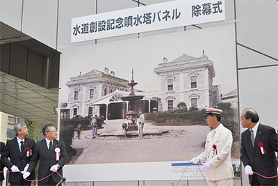 市水道局は桜木町駅前の広場で10月17日、水道創設記念噴水塔の壁面パネル除幕式を行った。