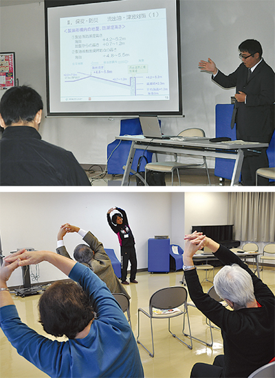 今回の講座では、参加企業の一つで、地域に隣接するJX日鉱日石エネルギー(株)根岸製油所の担当者が、タンクの耐震性や津波対策など災害に対する同社の安全対策を解説。参加者からは「あれだけ大きな施設なので災害があったら心配だけど、いろいろ対策していることを知れて勉強になった」などの声が聞かれた。