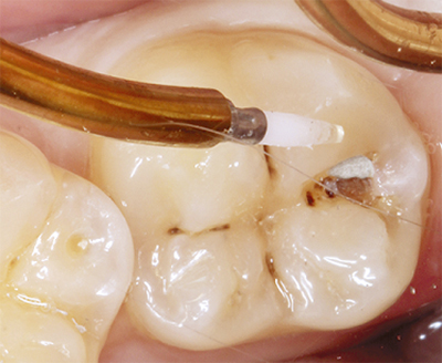 吉野敏明理事長が開発に関わるレーザー治療法は、ピンポイントで虫歯組織を気化し分解するというもの。回転切削器具を使用した場合より、比較的痛みが少ないのが特徴で、切削音や振動がほとんどないという。同時に殺菌洗浄が可能、衛生的で歯石除去にも有効とされる。