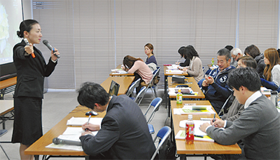 また、アナフィラキシーに対するアドレナリン自己注射「エピペン」の実技研修も実施。インストラクターの免許を持つ同センターの保健師・兼松直子氏が、「腿に5秒ほど打つ。1人ではなく、できれば3人くらいで注射してください」などと説明しながら、デモ機を用いて一人ひとりに指導していた。