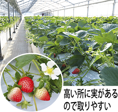同農園は「高設」なので、楽な姿勢でいちご狩りができる。ベビーカーや車いすも入れるので、家族や団体、仲間と楽しんでみては。