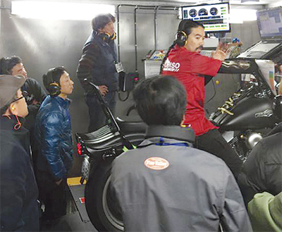 当日は、小磯さんのチューニング技術を学ぼうと日本全国から10人のメカニックが参加。同店に昨年導入されたダイノマシンと呼ばれる特別な機械を使い、エンジンの調整や最適化の技術について指導を受けた。